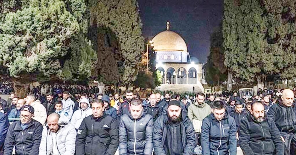 ফিলিস্তিনসহ মধ্যপ্রাচ্যের অধিকাংশ দেশে বুধবার থেকে পবিত্র রমজান শুরু হওয়ায় মঙ্গলবার (১৭ ফেব্রুয়ারি) রাতে আল-আকসা মসজিদ প্রাঙ্গণে প্রথম তারাবিহ নামাজে অংশ নেন হাজার হাজার ফিলিস্তিনি। মসজিদের প্রার্থনালয় ও খোলা প্রাঙ্গণগুলো নামাজের সময় পূর্ণ ছিল বলে প্রত্যক্ষদর্শীরা জানান। আল-আকসা মসজিদের খতিব শেখ ইউসুফ আবু স্নেইনে নামাজের নেতৃত্ব দেন। অনলাইনে ছড়িয়ে পড়া ফুটেজে দেখা গেছে ইসরায়েলি পুলিশ মসজিদের চারপাশ ঘিরে রেখেছে এবং প্রার্থীদের উপস্থিতিতে নিরাপত্তা তদারকি করছে।