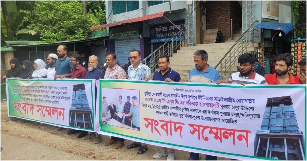 কুমিল্লার এএফসি হেলথ লিমিটেড হাসপাতাল পুনরায় চালুর জন্য ব্যাপক আন্দোলন ও মানববন্ধন অনুষ্ঠিত হয়েছে। বিনিয়োগকারীরা এই হাসপাতালটির দ্রুত কার্যক্রম শুরু করার জন্য দারুণ উৎসাহ ও দাবি প্রকাশ করেছেন। বুধবার (১ অক্টোবর) সকালে কুমিল্লা প্রেসক্লাবে আয়োজিত সংবাদ সম্মেলনে তারা জানিয়েছেন, তারা দীর্ঘদিন ধরে এই হাসপাতালটি চালুর জন্য বিভিন্ন চেষ্টা চালাচ্ছেন। এরপর প্রেসক্লাবের সামনে এক শক্তিশালী মানববন্ধন কর্মসূচি পালিত হয়, যেখানে শতাধিক মানুষ অংশ নেন।