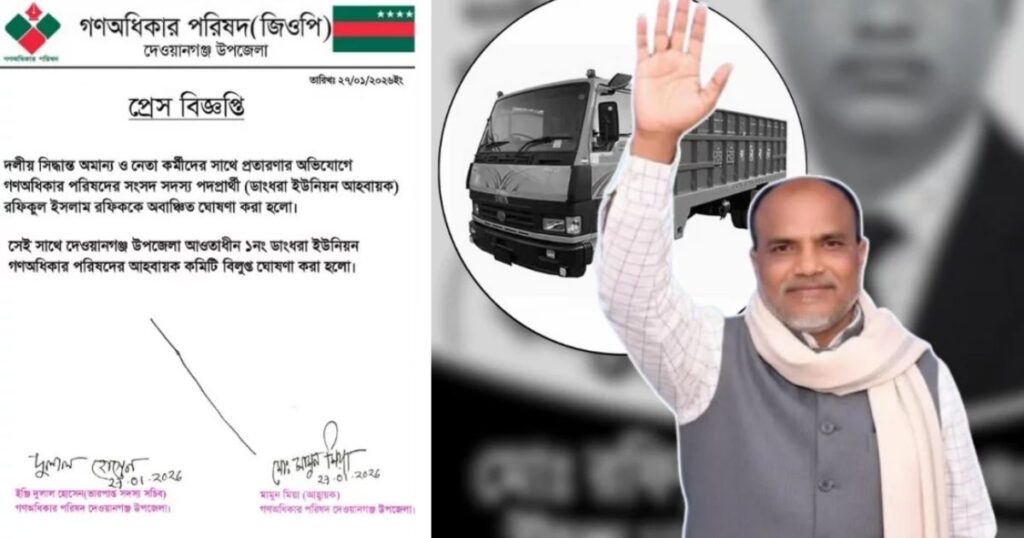 আসন্ন ত্রয়োদশ জাতীয় সংসদ নির্বাচনে জামালপুর-১ (দেওয়ানগঞ্জ–বকশীগঞ্জ) আসনে গণ অধিকার পরিষদের মনোনীত ট্রাক প্রতীকের প্রার্থী রফিকুল ইসলাম রফিকের বিরুদ্ধে গুরুতর অভিযোগ ওঠার পর তাকে দলীয়ভাবে অবাঞ্ছিত ঘোষণা করা হয়েছে। দেওয়ানগঞ্জ উপজেলা গণ অধিকার পরিষদ গত মঙ্গলবার রাতের এক জরুরি সভায় এই সিদ্ধান্ত নেয়, যেখানে অভিযোগের ভিত্তিতে জানানো হয় যে, রফিকুল ইসলাম কেন্দ্রীয় নেতাদের নির্দেশনা না মেনে নিজস্বভাবে কার্যক্রম চালাচ্ছিলেন ও তৃণমূল নেতা-কর্মীদের সঙ্গে প্রতারণার মাধ্যমে দলের শৃঙ্খলা ভঙ্গ করেছেন। এর ফলে তার নেতৃত্বাধীন ডাংধরা ইউনিয়ন গণ অধিকার পরিষদ কমিটিও বিলুপ্ত ঘোষণা করা হয়েছে।