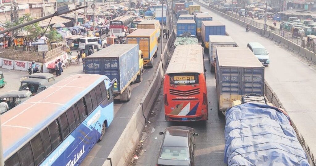 ঢাকা-চট্টগ্রাম মহাসড়কের নারায়ণগঞ্জের সোনারগাঁয়ে কাঁচপুর সেতু থেকে মেঘনা সেতুর টোল পর্যন্ত প্রায় ১০ কিলোমিটার এলাকাজুড়ে তীব্র যানজট সৃষ্টি হয়েছে। মূল কারণ হলো মহাসড়কের মদনপুর এলাকায় একটি মালবাহী ট্রাক বিকল হয়ে গেলে চট্টগ্রামগামী লেনে মোড়ক লাগতে শুরু করে। গভীর রাতের সময়ে অবসন্ন এই বিকল হওয়া ট্রাকের কারণে বুধবার (৩১ ডিসেম্বর) বিকেল ৩ টার দিকে সড়কজুড়ে যানবাহনের চলাচল সম্পূর্ণ বন্ধ হয়ে যায় এবং যানজটের প্রভাব দীর্ঘ সময় ধরে অব্যাহত থাকে। এর পরে মহাসড়কের চট্টগ্রামমুখী লেনে ধীর গতিতে যানবাহন চলতে দেখা যায়। পরিস্থিতি নিয়ন্ত্রণে আনতে কাঁচপুর ও শিমরাইল হাইওয়ে পুলিশ তৎপরতা চালায়। ভুক্তভোগী বিভিন্ন যাত্রীরাও চরম ভোগান্তিতে পড়েছেন।