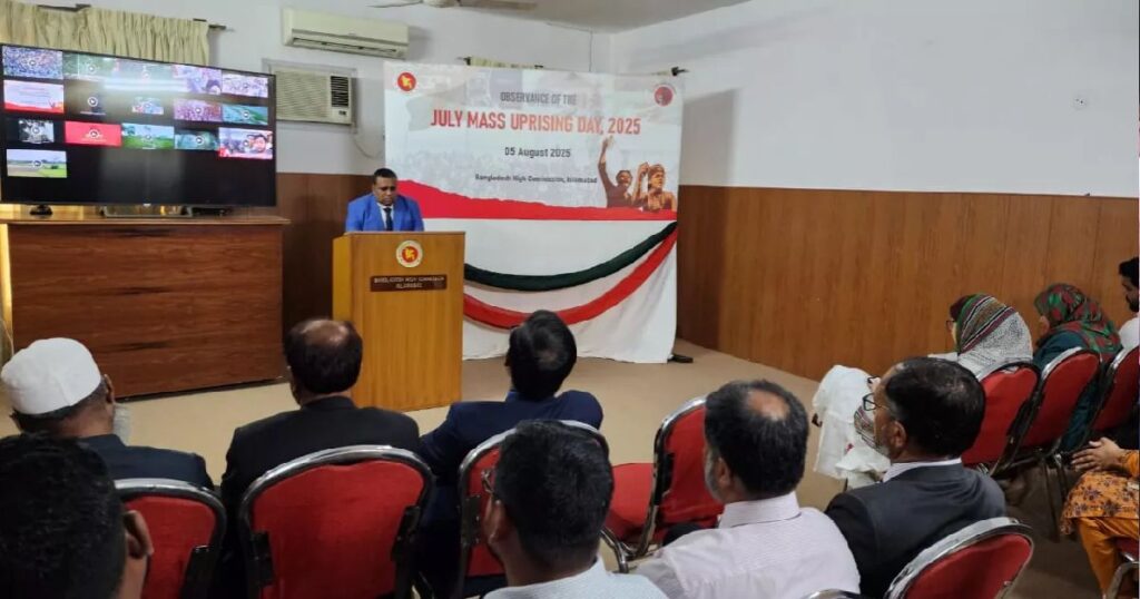 পাকিস্তানের ইসলামাবাদে অবস্থিত বাংলাদেশের হাইকমিশনে মঙ্গলবার, ২০২৫ সালের জুলাই গণঅভ্যুত্থান দিবস যথাযোগ্য মর্যাদায় উদযাপিত হয়েছে। সকাল পৌনে ৯টায় ইসলামাবাদের ডিপ্লোমেটিক এনক্লেভে নবনির্মিত বাংলাদেশ চ্যান্সেরি কমপ্লেক্স প্রাঙ্গণে পাকিস্তানে নিযুক্ত বাংলাদেশের হাইকমিশনার মো. ইকবাল হোসেন খান লিপিবদ্ধ কর্মকর্তাদের সঙ্গে জাতীয় সঙ্গীত গেয়ে জাতীয় পতাকা উত্তোলন করেন।