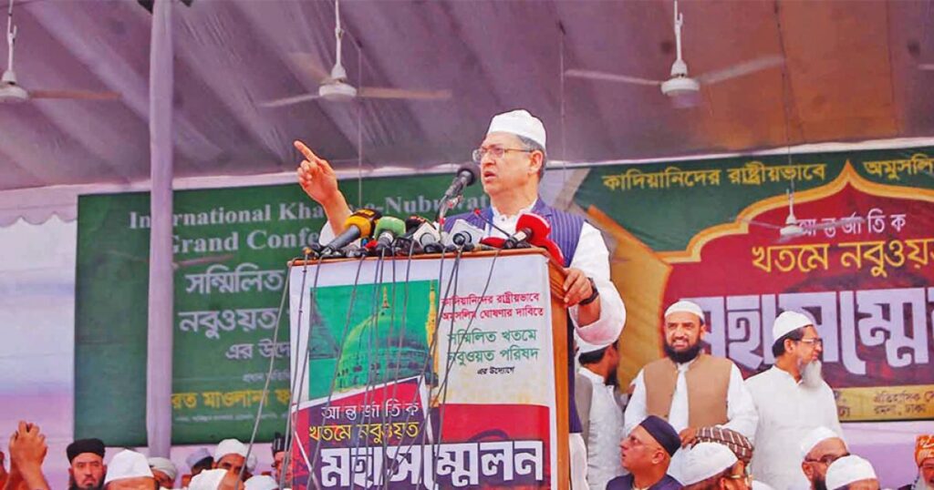 বিএনপি ক্ষমতায় গেলে ‘আল্লাহর ওপর আস্থা ও বিশ্বাস’ সংবিধানে পুনর্বহাল করবে বলে ঘোষণা দিয়েছেন দলের স্থায়ী কমিটির সদস্য সালাহউদ্দিন আহমদ। তিনি গতকাল শনিবার ঢাকা में এক বিশাল সমাবেশে বলেন, জাতির পিতা শহীদ রাষ্ট্রপতি জিয়াউর রহমান বাংলাদেশের সংবিধানে প্রথমবারের মতো ‘বিসমিল্লাহির রাহমানির רাহিম’ এই বাক্যটি সংযোজন করেছিলেন, যা এখনও বহাল রয়েছে। অনেকের চেষ্টা ছিল এটি সরিয়ে দেওয়ার, তবে তারা ব্যর্থ হয়েছেন। সালাহউদ্দিন আহমদ আরও উল্লেখ করেন, কিন্তু যারা মূলনীতির অংশ আকারে এই বিষয়টি তুলে নেওয়ার চেষ্টা করেছে, তারা সফল হয়নি। তিনি বলেন, ‘শহীদ রাষ্ট্রপতি জিয়াউর রহমান সংবিধানে অন্তর্ভুক্ত করেছিলেন, মহান আল্লাহর ওপর আস্থা ও বিশ্বাস—এটি সংবিধানের প্রস্তাবনায় এবং রাষ্ট্র পরিচালনার মূলনীতির মধ্যে ছিল। তবে কিছু কারণে বর্তমানে এটি বাদ গেছে।’ এসময় তিনি জনগণকে প্রশ্ন করেন, বিএনপি কি সেটি পুনর্বহাল করবে কি না? সম্মেলনে উপস্থিত নেতাকর্মীরা একযোগে হ্যা উত্তর দিলে তিনি বললেন, ‘ইনশাল্লাহ, আমরা এটা আবার সংবিধানে অন্তর্ভুক্ত করব।’ তিনি আরও বলেন, ‘আমরা যদি বাংলাদেশের সরকার পরিচালনার দায়িত্ব আল্লাহ রহমত করুক, দেশের জনগণ আমাদেরকে ভালোবাসা ও সহযোগিতা করেন, তাহলে এই স্বপ্ন বাস্তবায়ন সম্ভব। পীরে কামেল, উলামায়ে কেরাম এবং দেশের বরেণ্য ধর্মীয় নেতৃবৃন্দের সহযোগিতায়, সবাই একসাথে থাকলে আমরা এই দাবি এবং অন্যান্য পাওয়া প্রস্তাবগুলো জাতীয় সংসদে আলোচনা করে গ্রহণ করতে পারব।’ তিনি ব্যক্ত করেন, দেশের উন্নয়ন, শান্তি এবং ধর্মীয় মূল্যবোধ রক্ষায় জাতিকে ঐক্যবদ্ধ থাকতে হবে। সালাহউদ্দিন আহমদ বলেন, ‘আমরা মুসলমান, আমাদের বিশ্বাস—লা ইলাহা ইল্লাল্লাহু মুহাম্মাদুর রসুলুল্লাহ। রাসুলুল্লাহ (সা.) বলেছেন, আমি আখেরি নবী, এরপর আর কোন নবী আসবেন না। যারা নিজেকে নবী দাবি করেন, তারা এই বাণীর বাহিরে। আমরা রাসুলের নবী হিসেবে বিশ্বাস করি এবং কলেমা পাঠ করে মুসলমান হয়েছি। বাংলাদেশিরা দেশপ্রেমে অটুট, এখানকার প্রাকৃতিক ও ধর্মীয় মূল্যবোধের প্রতি আমাদের গভীর শ্রদ্ধা।’ আন্তর্জাতিক খতমে নবুওয়ত মহাসম্মেলনটি অনুষ্ঠিত হয় খতমে নবুয়তের দাবিতে। এতে বাংলাদেশ, পাকিস্তান, ভারত, সৌদি আরব, মিশরসহ বিভিন্ন দেশে থেকে আলেম-উলামা ও ধর্মীয় চিন্তাবিদরা অংশ নেন। পাকিস্তানের জমিয়তে উলামায়ে ইসলাম সভাপতি ফজলুর রহমান প্রধান অতিথি হিসেবে বক্তব্য দেন। এছাড়া, মধুপুরের পীর আল্লামা আব্দুল হামিদের সভাপতিত্বে অনুষ্ঠানে বক্তব্য দেন ভারতের জমিয়তে উলামায়ে হিন্দের সভাপতি সাইয়্যিদ মাহমুদ মাদানি, পাকিস্তানের বেফাকুল মাদারিসিল আরাবিয়া মহাসচিব হানিফ জালন্দরি, মিসরের আল আজহার বিশ্ববিদ্যা