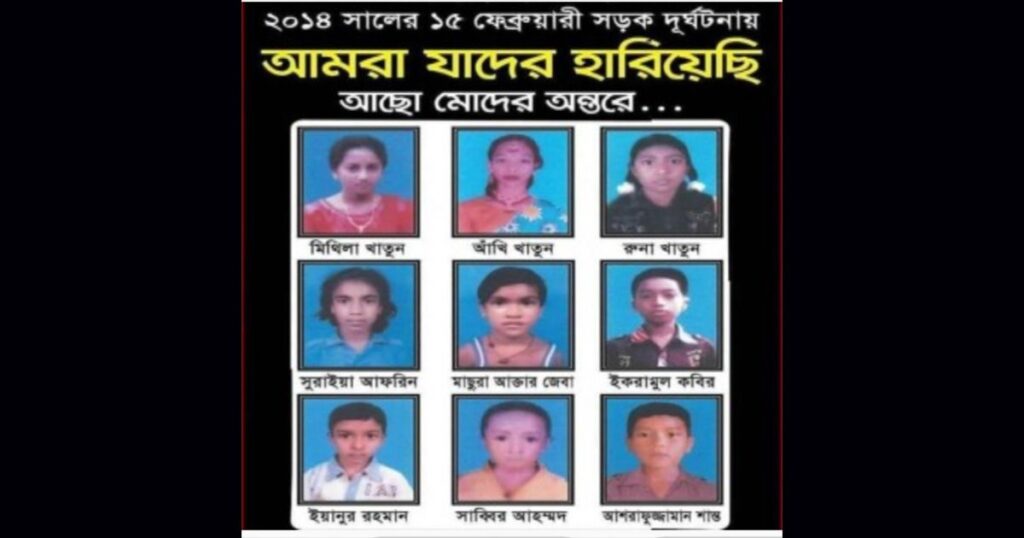 ২০১৪ সালের ওই দিন বিদ্যালয়ের শিক্ষার্থীরা একটি শিক্ষা সফরে মুজিব নগরে গেলে ফেরার পথে চৌগাছা হয়ে বেনাপোলে ফেরার সময় ঝাউতলা কাঁদবিলা পুকুরপাড় নামক স্থানে একটি মর্মান্তিক সড়ক দুর্ঘটনা ঘটে। ঘটনাটিতে মোট নয়জন শিশুশিক্ষার্থী নিহত হন এবং আরও প্রায় ৪৭ জন আহত হন; কিছু নিহত ঘটনাস্থলেই ও কিছু পরে হাসপাতালে মারা যান। মৃত শিশুদের মধ্যে ছিলেন সুরাইয়া (১০), জেবা আক্তার (৮), মিথিলা (১০), রুনা আক্তার মীম (৯), শান্ত (৯), সাব্বির হোসেন (১০), আঁখি (১১), ইকরামুল (১১) এবং ইয়ানুর রহমান (১১)। ইকরামুল চিকিৎসাধীন অবস্থায় দুর্ঘটনার ১৩ দিন পর ঢাকায় সম্মিলিত সামরিক হাসপাতালে মারা যান; আর ইয়ানুর রহমান ওই দুর্ঘটনার ৩২ দিন পর ১৯ মার্চ চিকিৎসাধীন অবস্থায় জীবন হারান।