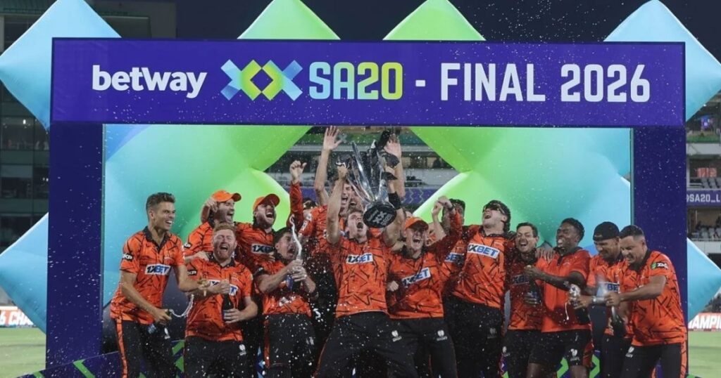 দক্ষিণ আফ্রিকার ঘরোয়া টি-টোয়েন্টি লিগ এসএ২০-এর চতুর্থ আসরেও নিজেদের আধিপত্য বজায় রাখল সানরাইজার্স ইস্টার্ন কেপ। সোমবার (২৬ জানুয়ারি) নিউল্যান্ডসে অনুষ্ঠিত ফাইনালে, প্রিটোরিয়া ক্যাপিটালসকে ৬ উইকেটে হারিয়ে দলটি গত চার বছরে তৃতীয়বারের মতো ট্রফি জেতলো। এই ম্যাচে শুরুতেই ডিজুটির মতো ঘটনা ঘটেছিল, যেখানে প্রিটোরিয়ার ব্যাটার ডেভাল্ড ব্রেভিস দুর্দান্ত এক সেঞ্চুরির মাধ্যমে ৫৬ বলে ১০১ রান করেন। তাঁর অসাধারণ ইনিংসের উপর ভিত্তি করে টিমের অন্য ব্যাটাররা সুবিধা করতে না পারলেও, ব্রেভিসের এই আক্রমণাত্মক পারফরম্যান্স মূলত দলের প্লে-অফের স্বপ্নের দ্বার প্রহর খুলে দেয়।