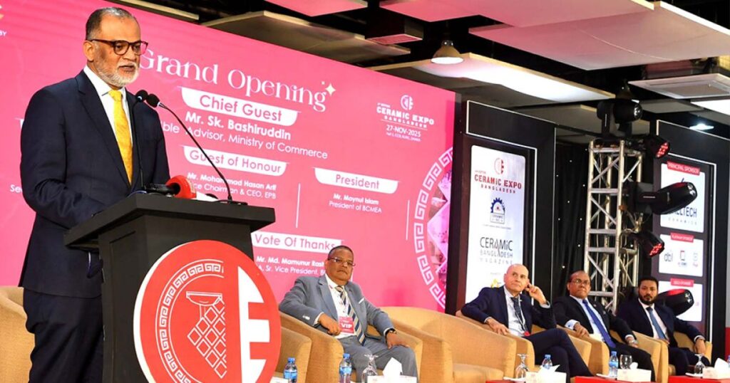 এ বছরের ৩০ নভেম্বর পর্যন্ত ইন্টারন্যাশনাল কনভেনশন সিটি বসুন্ধরাতে ‘চতুর্থ সিরামিক এক্সপো বাংলাদেশ-২০২৫’ চলবে, যা বাংলাদেশ সিরামিক ম্যানুফ্যাকচারার্স অ্যান্ড এক্সপোর্টার্স অ্যাসোসিয়েশনের (বিসিএমইএ) আয়োজনে অনুষ্ঠিত হচ্ছে। বোর্ডের সভাপতি মইনুল ইসলাম এর সভাপতিত্বে আয়োজিত এই উদ্বোধনী অনুষ্ঠানে বিশেষ অতিথি হিসেবে উপস্থিত ছিলেন বাংলাদেশের নিযুক্ত ইতালির রাষ্ট্রদূত অ্যান্তেনিও আলেসান্দ্রো, ইপিবির ভাইস চেয়ারম্যান মোহাম্মদ হাসান আরিফ এবং মেলার কমিটির চেয়ারম্যান ও বিসিএমইএর সাধারণ সম্পাদক ইরফান উদ্দীন।