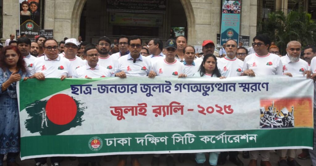 জুলাই গণ-অভ্যুত্থান দিবস উদযাপনের সূচনায় ঢাকার দক্ষিণ সিটি কর্পোরেশন (ডিএসসিসি) আজ বিভিন্ন কর্মসূচির আয়োজন করে। নগর ভবন থেকে শুরু হওয়া র্যালি, বৃক্ষরোপণ, বই মোড়ক উন্মোচন ও আলোচনা সভাসহ নানা কার্যক্রমে ডিএসসিসির কর্মকর্তা-কর্মচারীরা অংশ নেন।