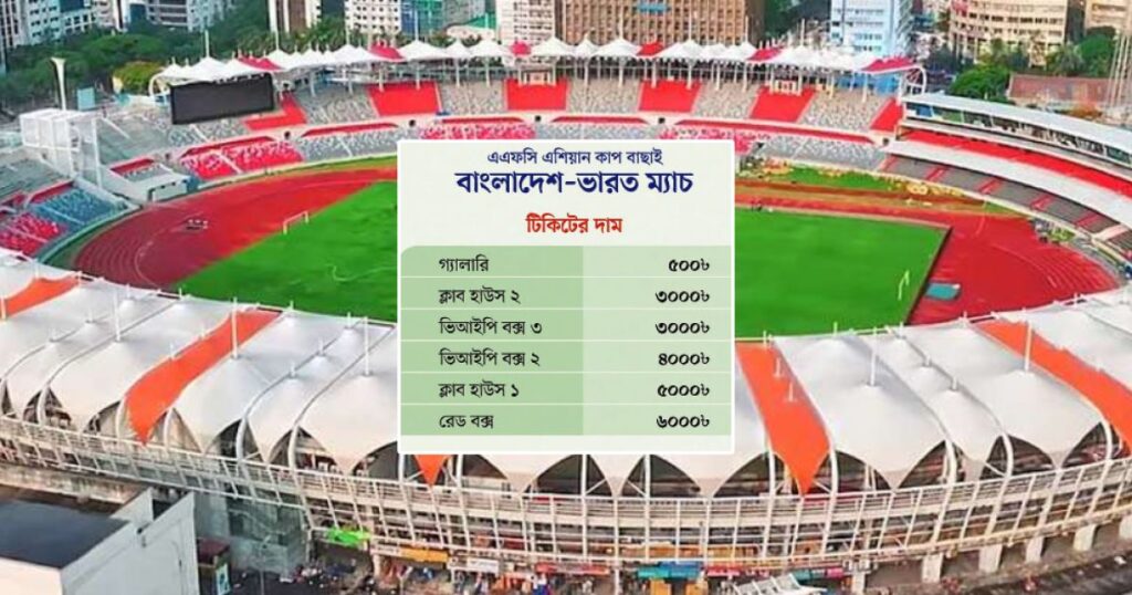 অভিন্নভাবে, ভিআইপি বক্স ২-এ বসে খেলোয়াড় হামজা, শমিত ও মোর্শালিনদের খেলা দেখতে চাইলে এক টিকিটের মূল্য ধার্য করা হয়েছে ৪ হাজার টাকা। অন্যদিকে, ক্লাব হাউস ১ ও রেড বক্সের টিকিটের দাম যথাক্রমে ৫ হাজার ও ৬ হাজার টাকা।